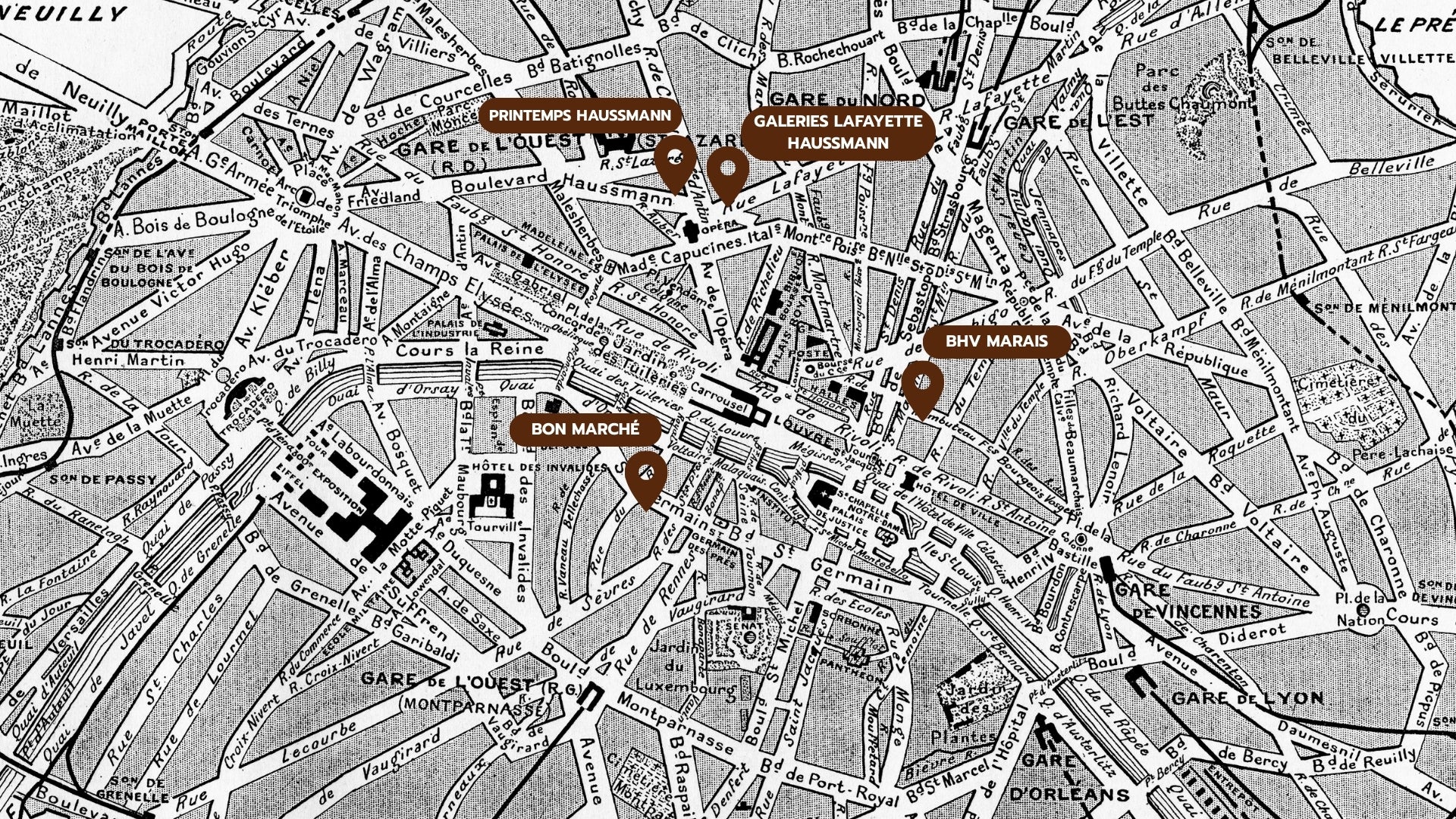Galeries Lafayette Haussmann, Le Bon Marché Rive Gauche, Printemps Haussmann, and BHV Marais.
