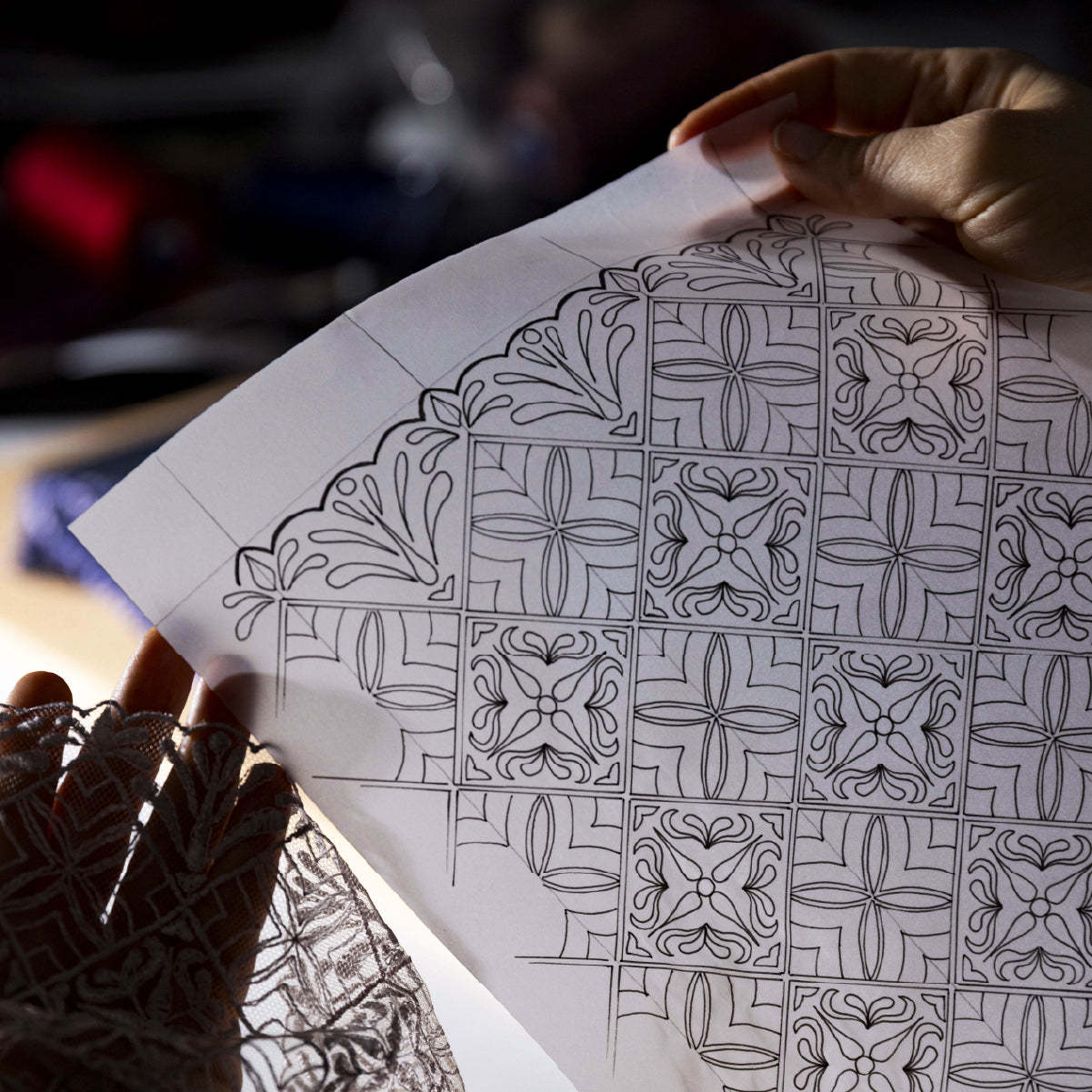 Calais Leavers lace, with its refined geometric motifs, sculpts the silhouette with a delicate precision. It meets an airy Italian point-d’esprit, adding both depth and lightness to the line. The expertise lies in this interplay of materials, designed to embrace the curves with effortless grace.